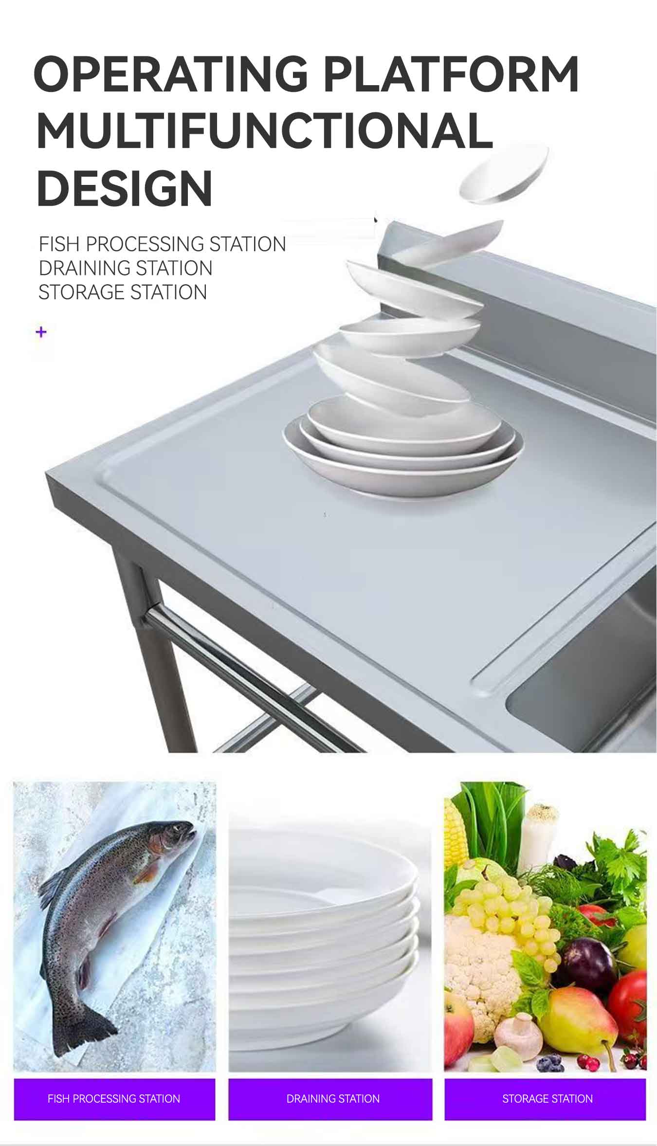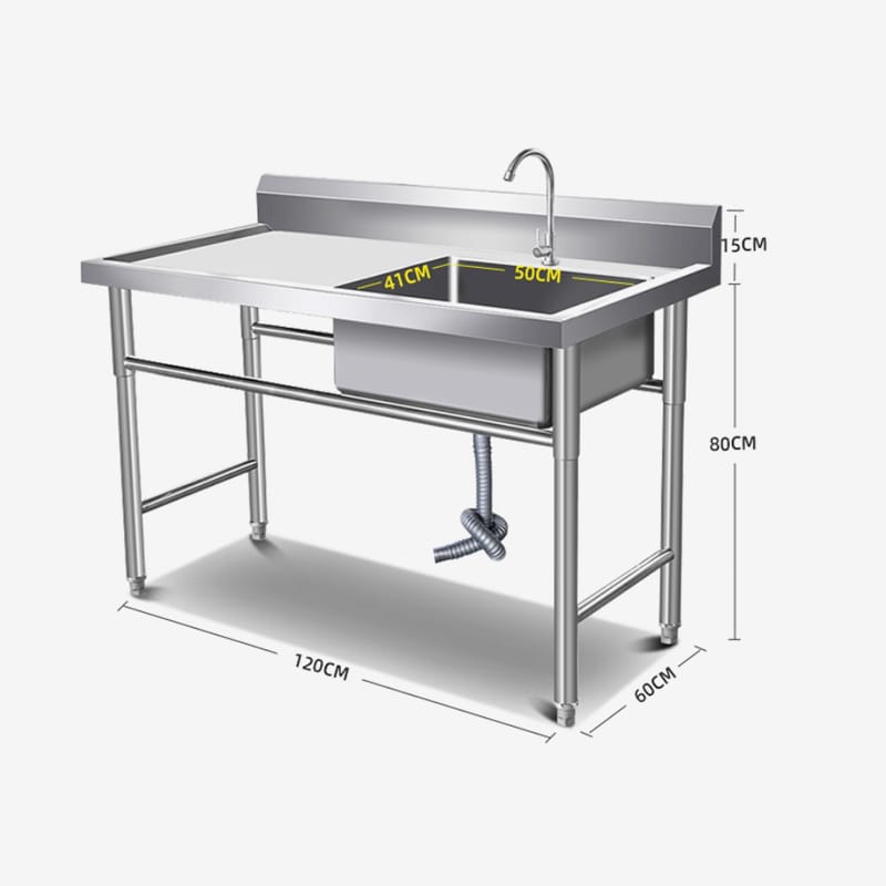 Desain Drainase yang Efisien: Permukaan pembuangan yang miring memungkinkan aliran air yang cepat dan pengeringan yang cepat, menjaga meja dapur tetap bersih dan kering.